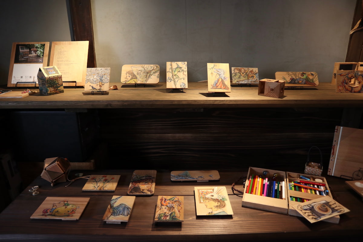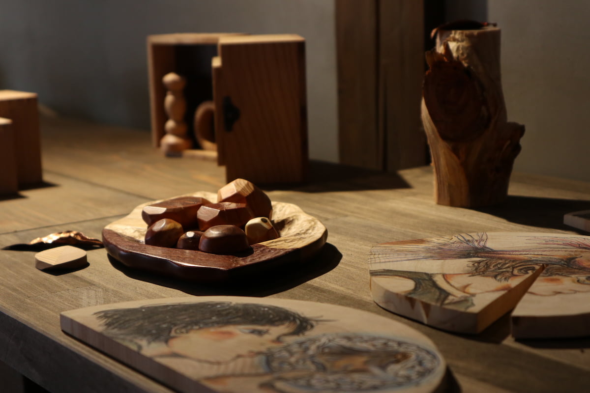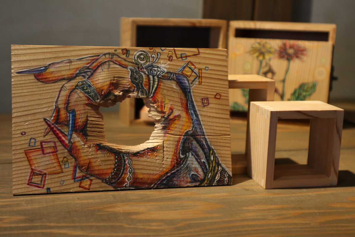 あかり:作っていく途中で、「この木に描きたい!」って衝動が起きるのが結構多くて。師匠の厳しい選別によってポイと捨てられたものを私が拾って、「この木はこれに見えるわ」とか。木目見て「これに見えたから、これ描くわ!」みたいな、「この風景に見えたのでこれ描いとこ」とか、とにかく木を見て題材を決めてます。